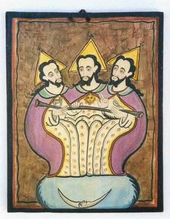 1. Three faces representing God the Father, Son, and Spirit, fused together and sharing one neck and connected to one body?